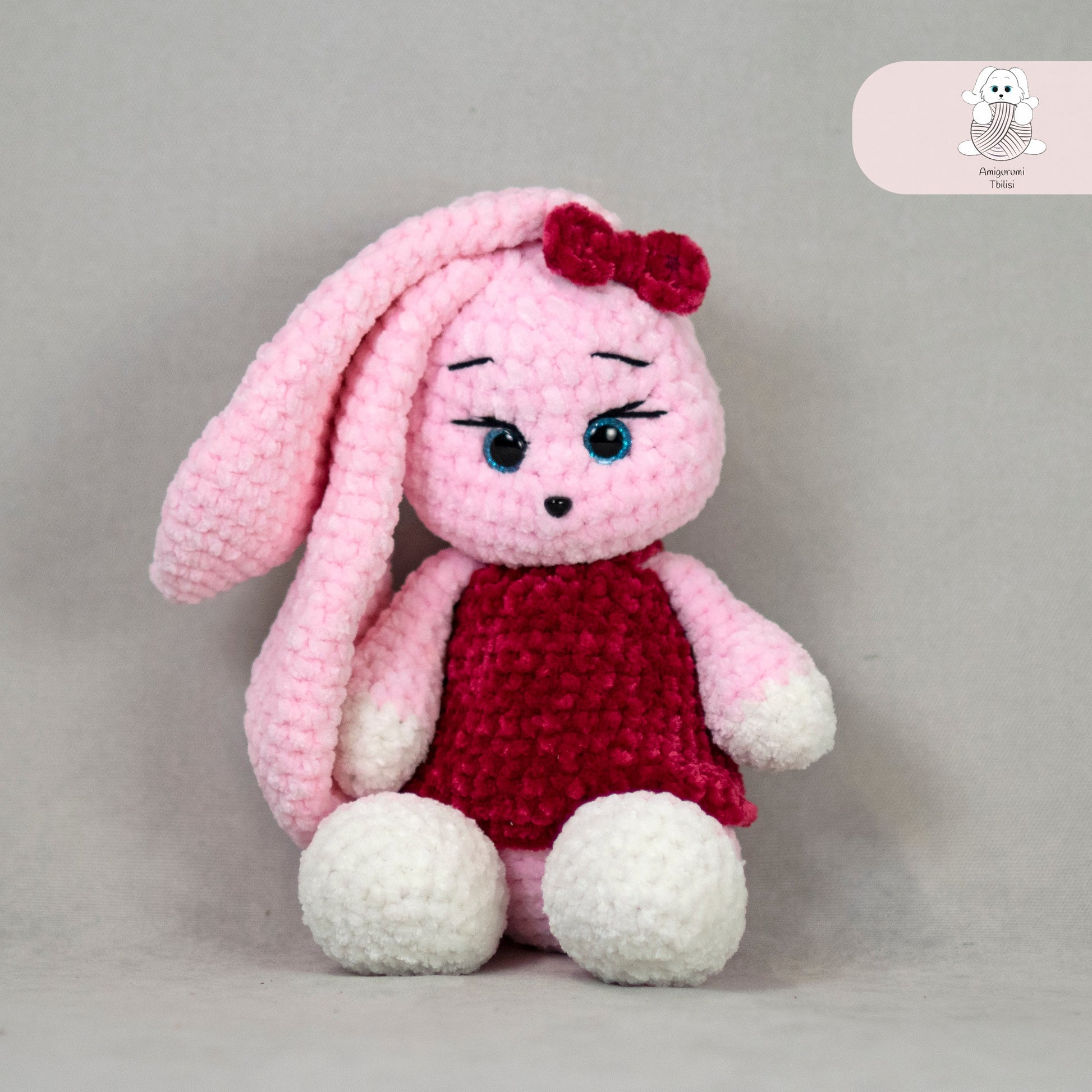 ვარდისფერი ხელნაკეთი სათამაშო ბაჭია წითელი კაბით და ბაფთით