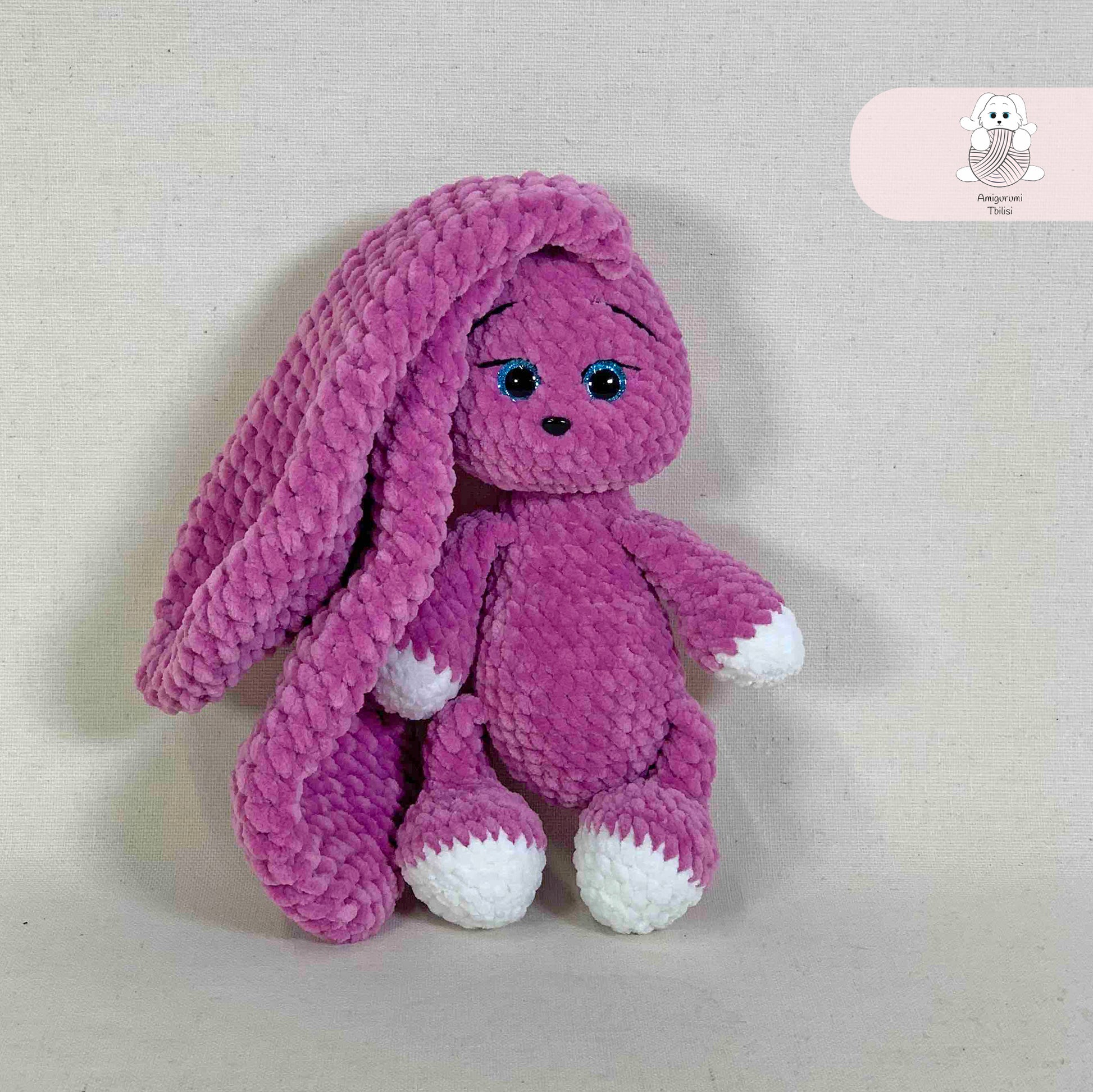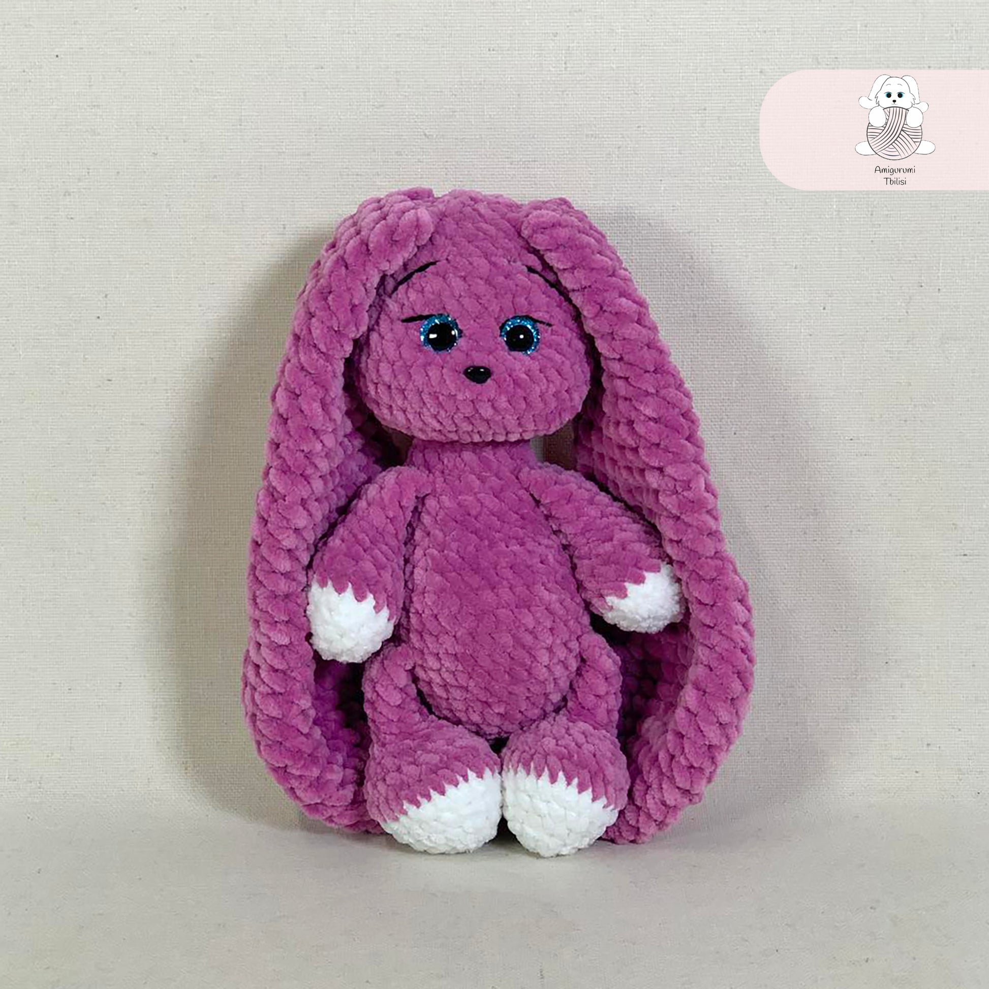 ხელნაკეთი სათამაშო ბაჭია, იისფერი, დიდი ყურებით. სიმაღლე: 23სმ.